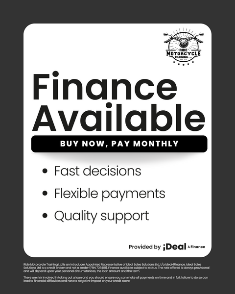 Ride Motorcycle Training Ltd is an Introducer Appointed Representative of Ideal Sales Solutions Ltd, t/a Ideal4Finance. Ideal Sales Solutions Ltd is a credit broker and not a lender (FRN 703401). Finance available subject to status. The rate offered is always provisional and will depend upon your personal circumstances, the loan amount and the term.
